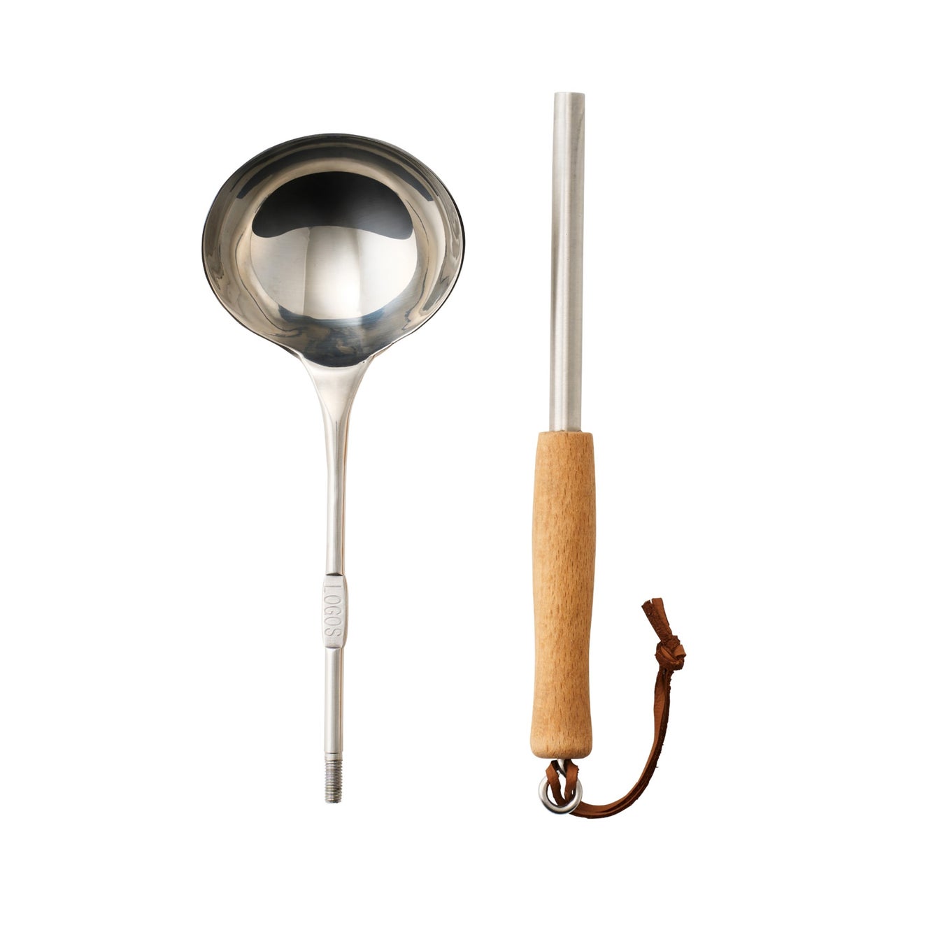 「LOGOS 鉄の職人中華お玉」は、全長40cmの持ち手で火元から離して持て、たき火での本格調理が可能です。本体は耐熱性や耐久性に優れたステンレス製、持ち手は熱が伝わりにくい木製で、火力の強い調理や、炒める、すくう、混ぜる、盛り付けるなど幅広く対応します。持ち手は分解でき、別売りの「中華鍋」には分解したお玉がぴったり収納できるので、組み合わせての使用がおすすめです。