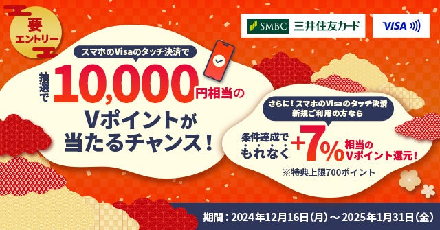 三井住友カード株式会社(本社:東京都江東区、代表取締役社長:大西 幸彦、以下:三井住友カード)は、2024年12月16日(月)より、対象カード限定で「スマホのVisaのタッチ決済で【誰でも】10,000円相当のVポイントが当たるチャンス!さらに【初めてなら】ご利用分の+7%還元キャンペーン!」を開始します。