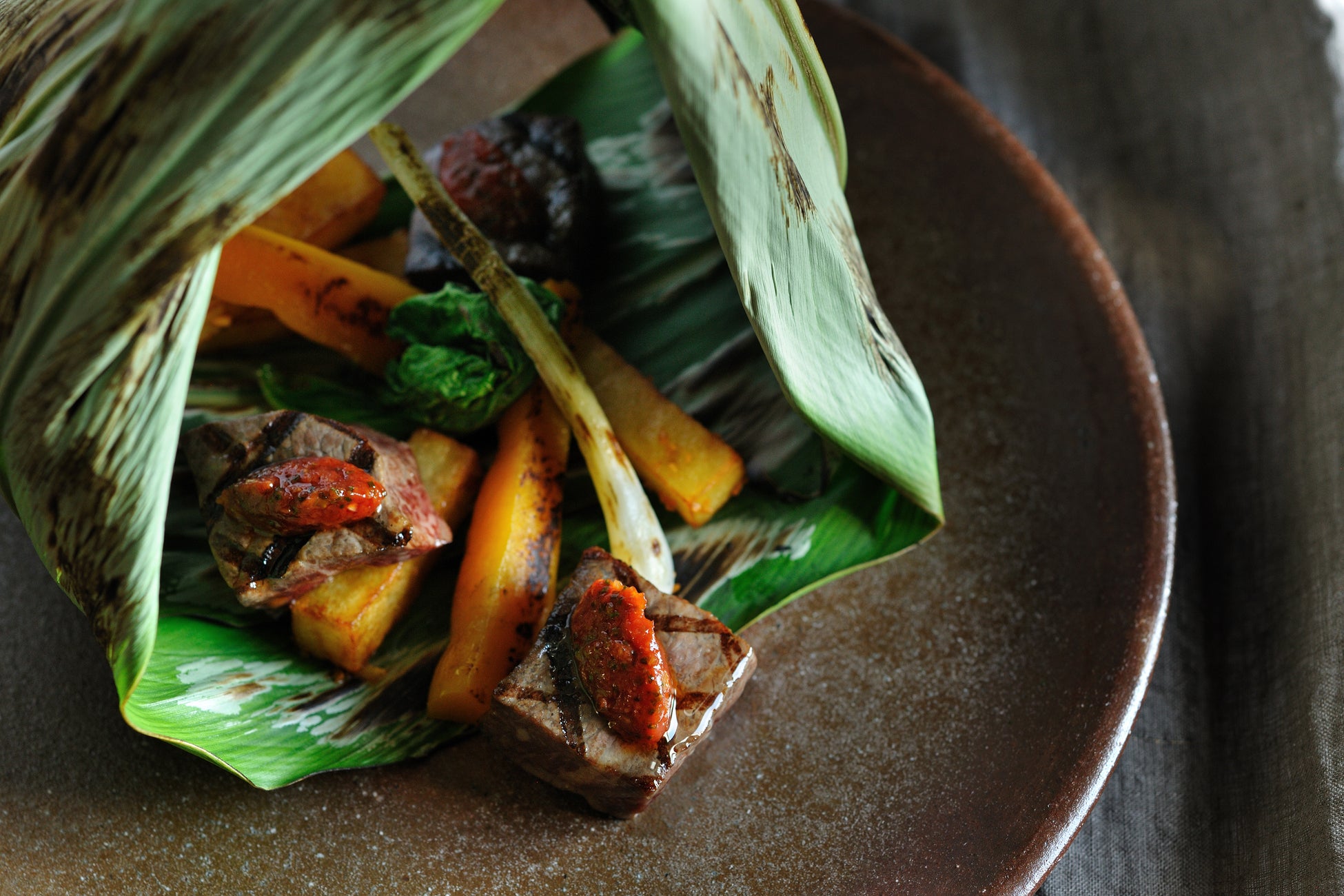 月桃の香りに癒されながら、良質なたんぱく質を頂く「牛フィレ肉の月桃包み焼き」