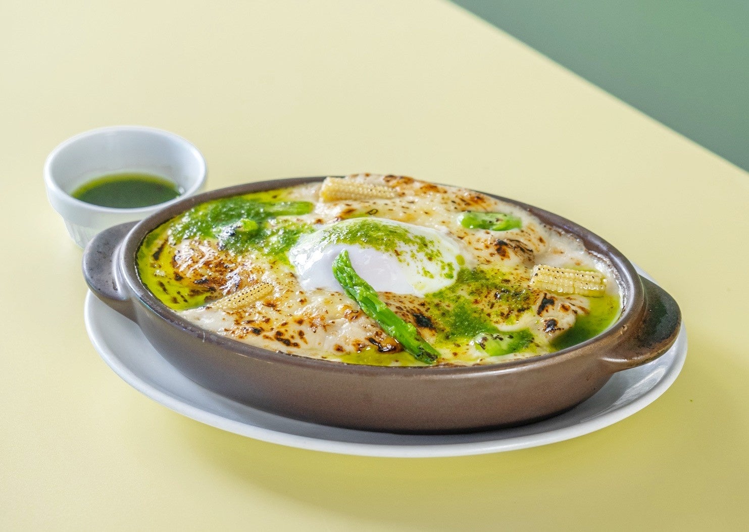・春野菜とチキンの温玉ドリアバジルソース添え