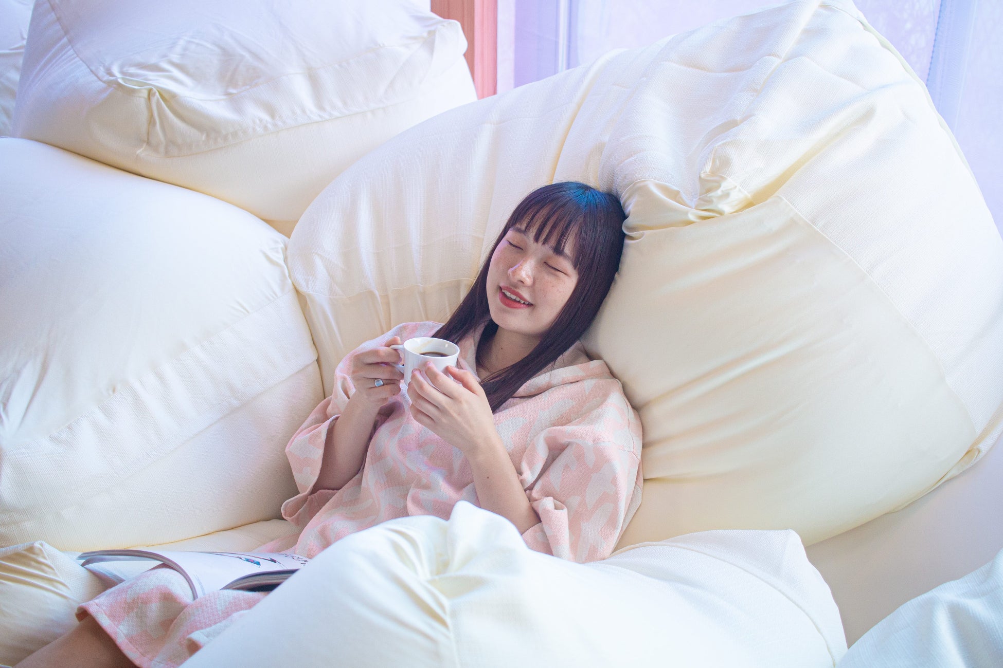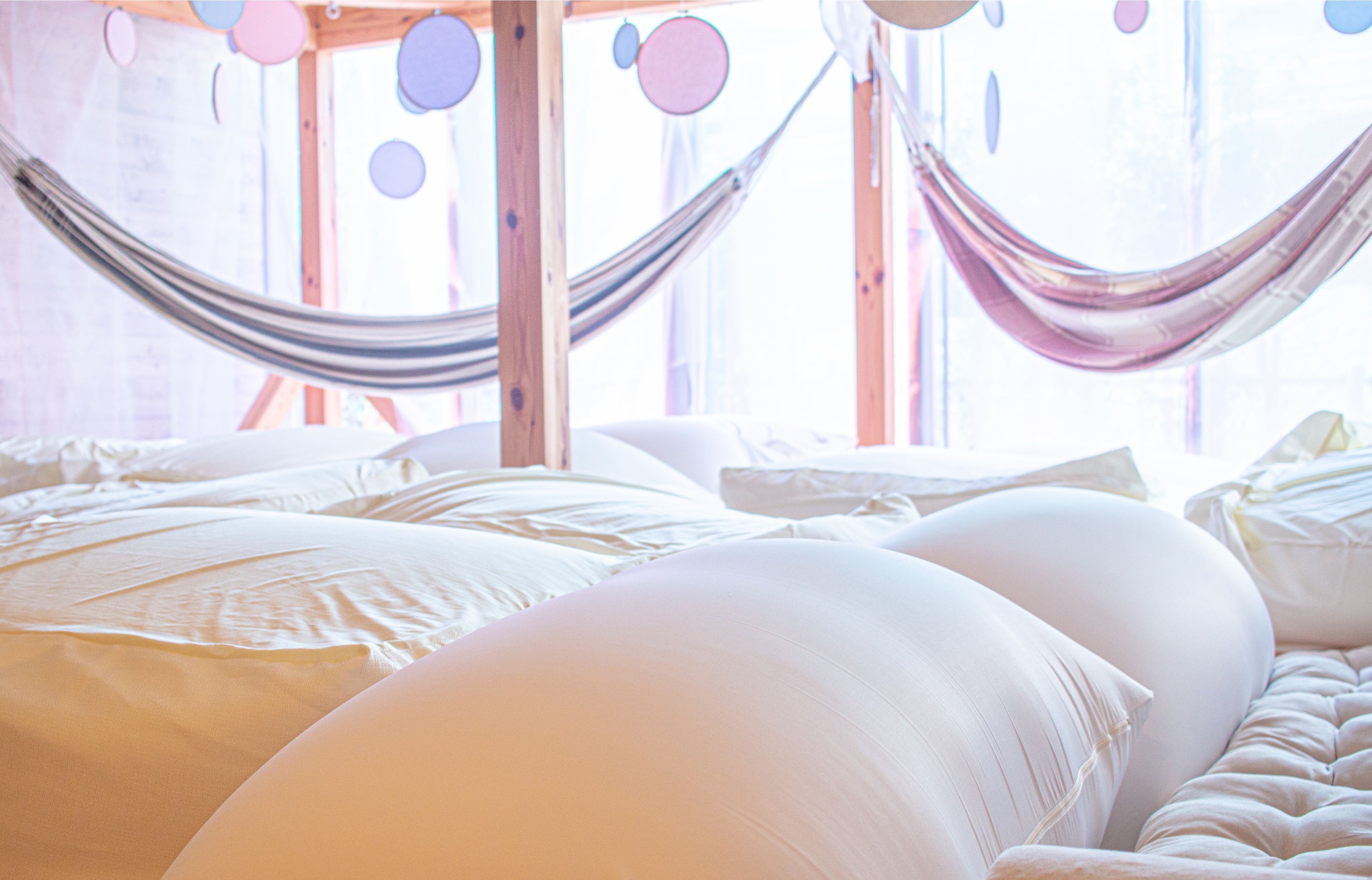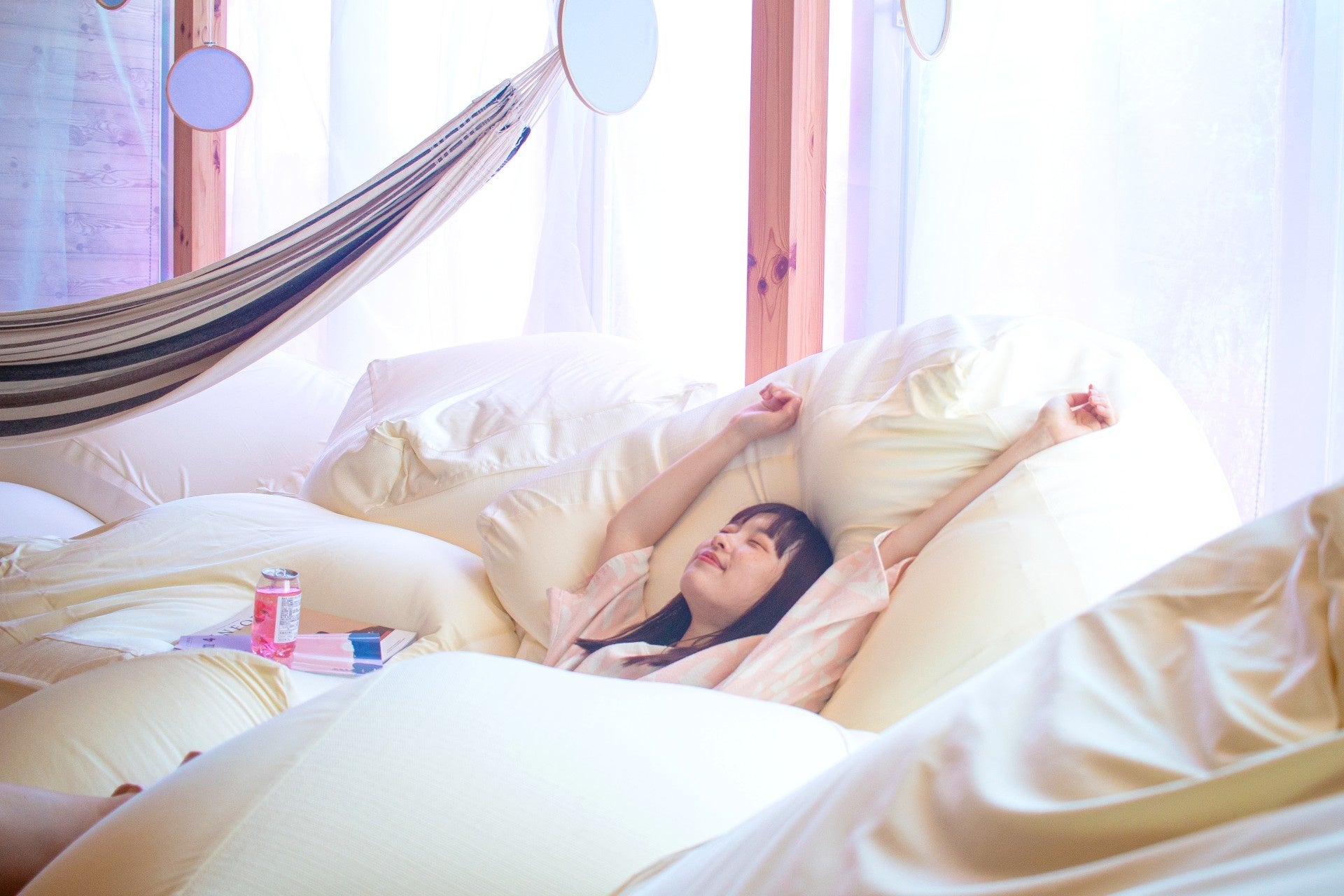 <館内でだらだら>まるで雲の上にいるようなー面のふわふわソファに埋もれるハンモックエリアが登場。