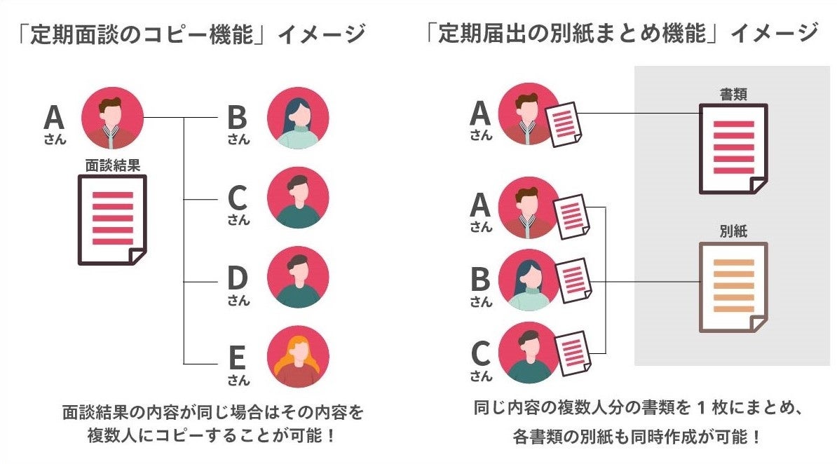 今回実装された「定期面談のコピー機能」は、面談の結果が同じだった場合に、その内容を複数人の書類にコピーして登録することが可能です。また、「定期届出の別紙まとめ作成」では、同じ内容の複数人分の書類を、一括にまとめて作成できるため、定期的に発生する書類作成業務の工数が大幅に削減できます。
