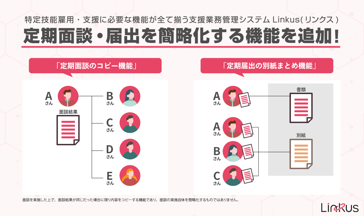 今回、Linkusに追加された「定期面談のコピー登録機能」「定期届出の別紙まとめ機能」は、定期的に発生する事務処理業務を簡略化したいという、導入企業様の声にこたえて実装いたしました。