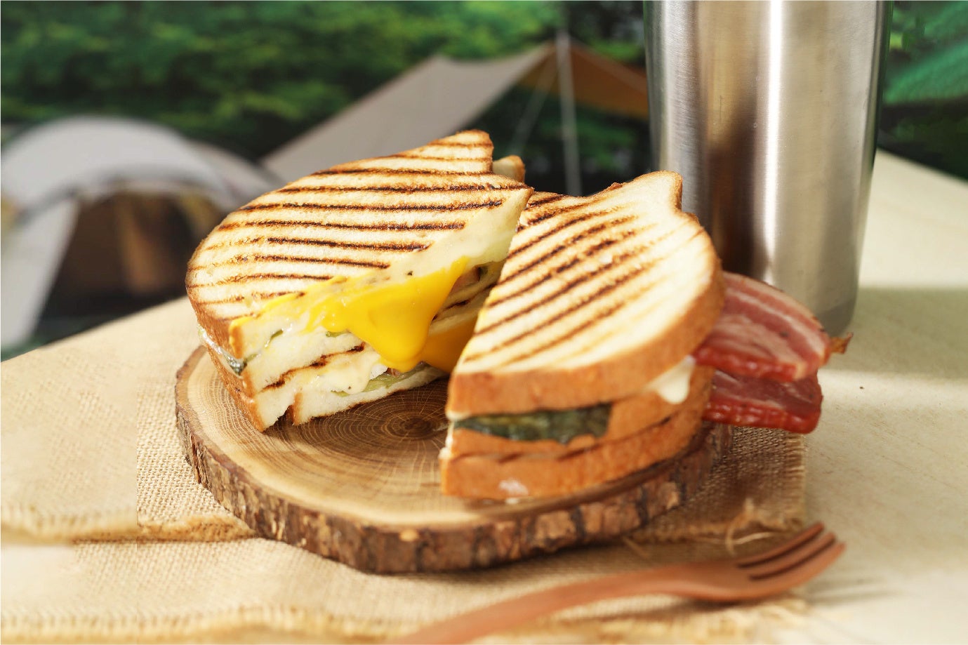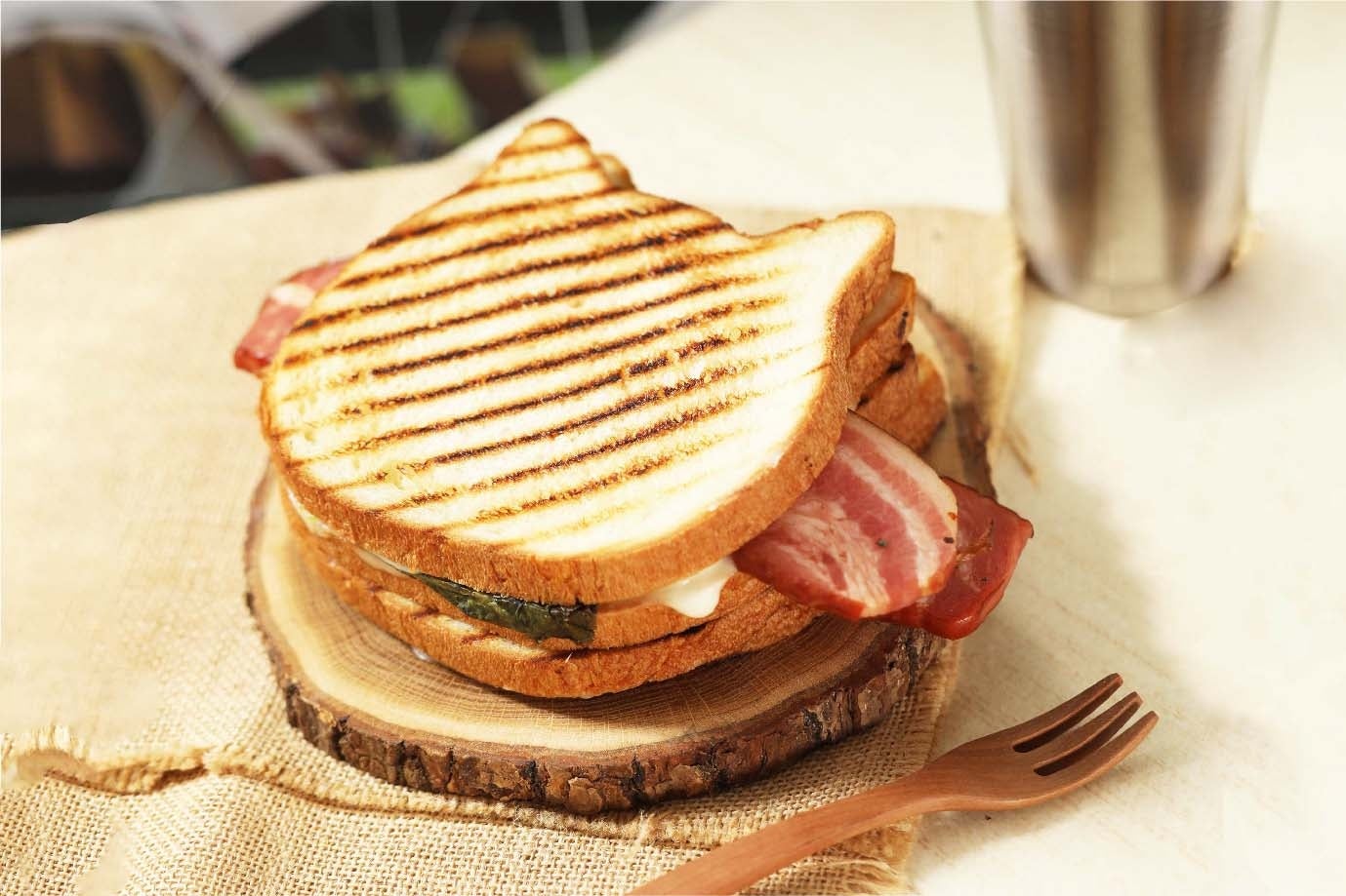 キャンプの朝食の定番“ホットサンド”が作りやすいように、「ねこねこ食パン」は薄くスライスした状態でお届けします。ぜひお好きな具材を挟んでお召し上がりください。