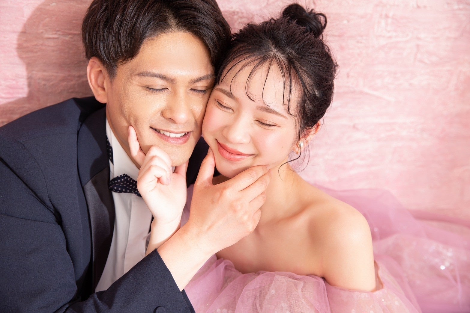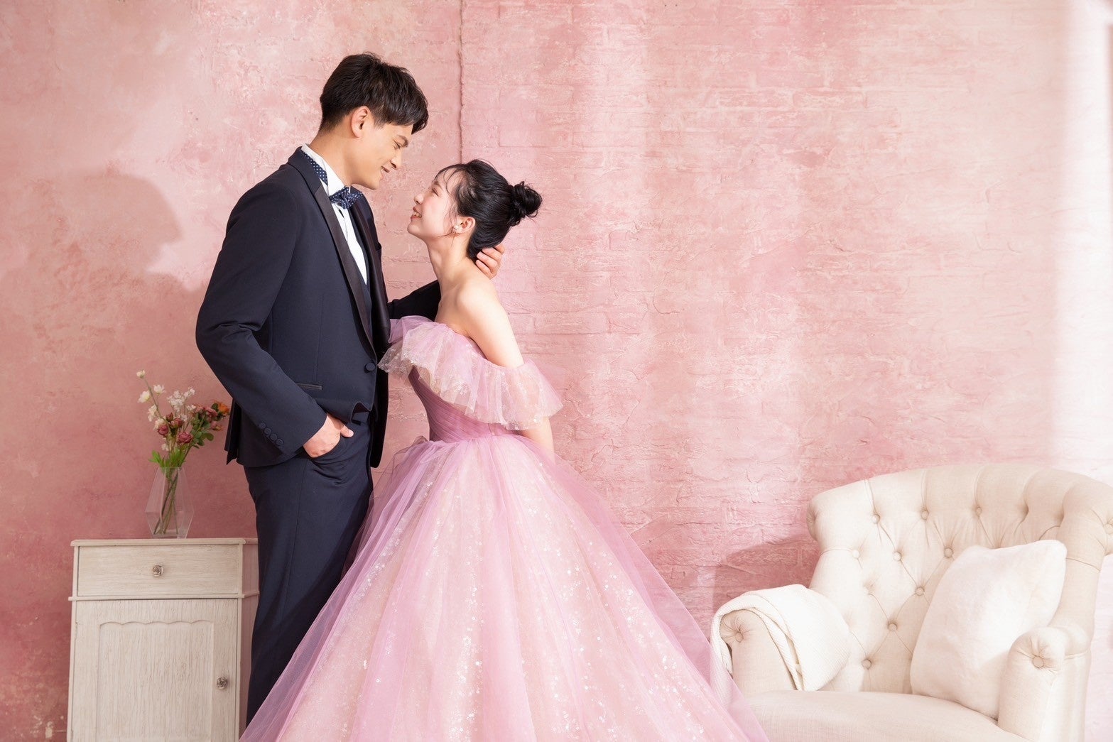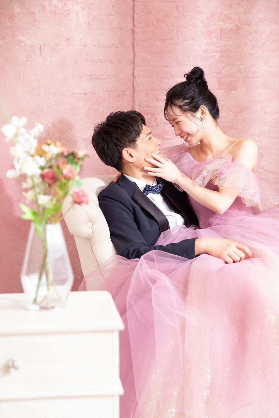 ピンク壁に 「ピンクドレス×ネイビータキシード」の組み合わせで