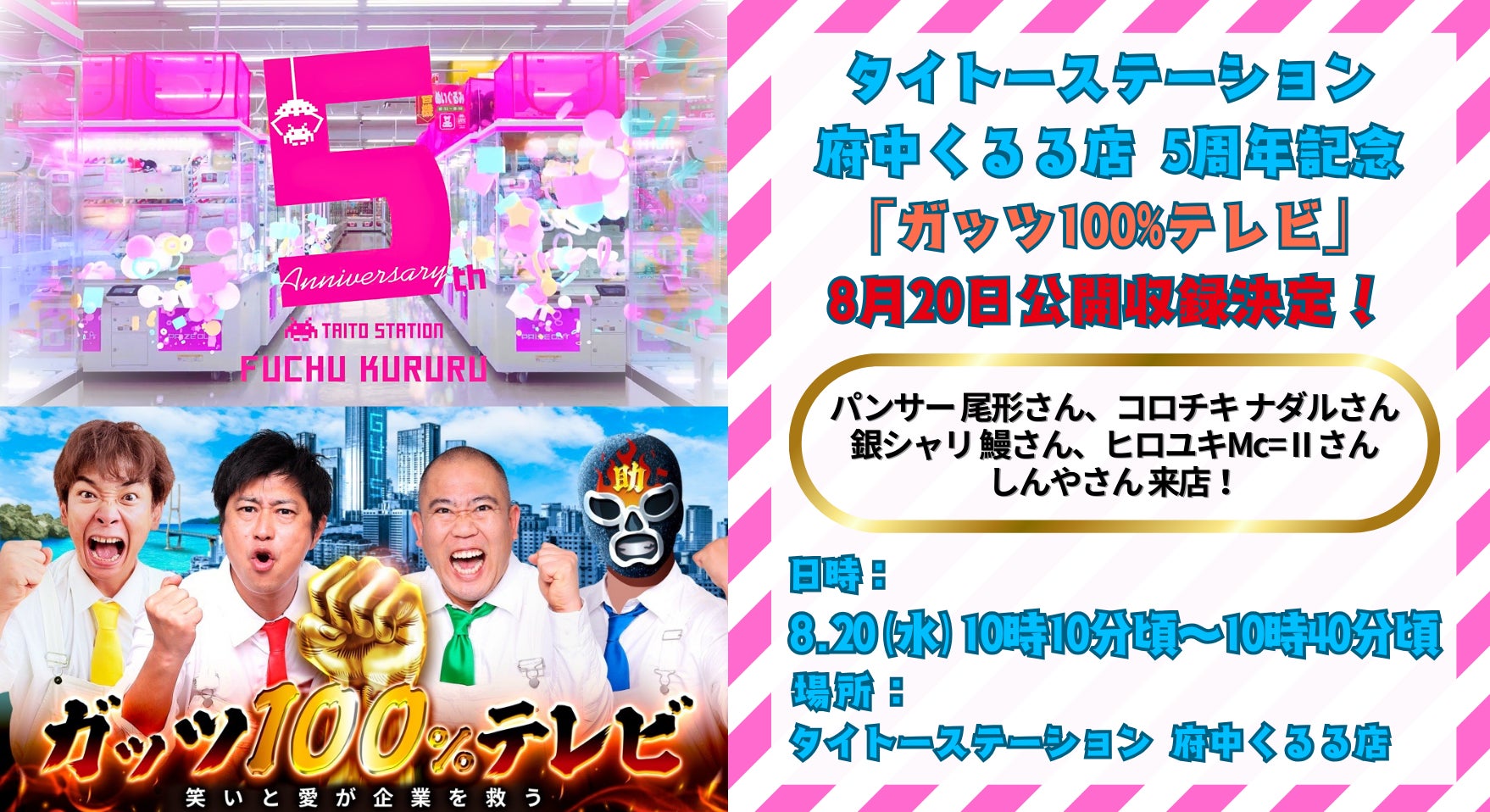 タイトーステーション 府中くるる店 5周年記念!パンサー尾形さん、コロチキナダルさんら出演「ガッツ100%テレビ」8月20日(水)10時10分頃~公開収録決定!(一般観覧無料)