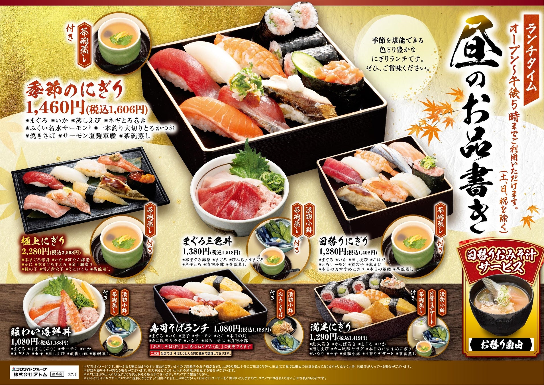 平日限定で午後5時まで販売(一部店舗で土曜日は午後4時まで販売)しているランチメニューは新鮮な旬のネタをお得に味わえます!2025年9月2日(火)より、秋限定のネタを使用した「季節のにぎり」も販売開始します。さらに、ランチタイムは日替りおみそ汁をご用意しており、セルフサービスでアツアツを何杯でも無料でお楽しみいただけます。職人が握る本格寿司をお手頃価格でご堪能いただけるランチメニューは、初めてにぎりの徳兵衛や海鮮アトムにご来店いただく方にも大変おすすめです。