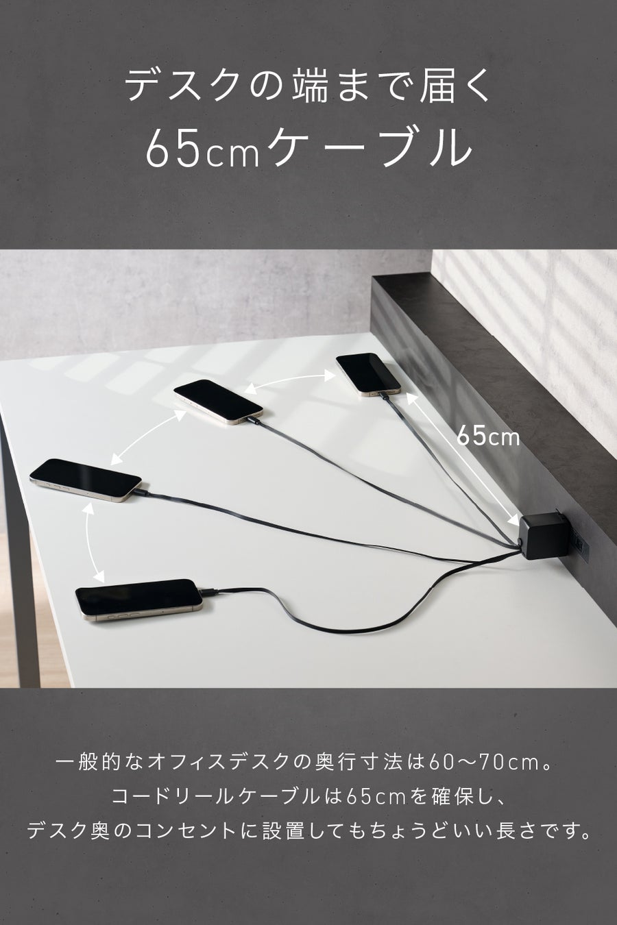 ケーブルを収納できるリール構造により、コンセントまわりやデスクがごちゃつかず、未使用時も美しい景観を保ちます。ほこりの付着も抑え、