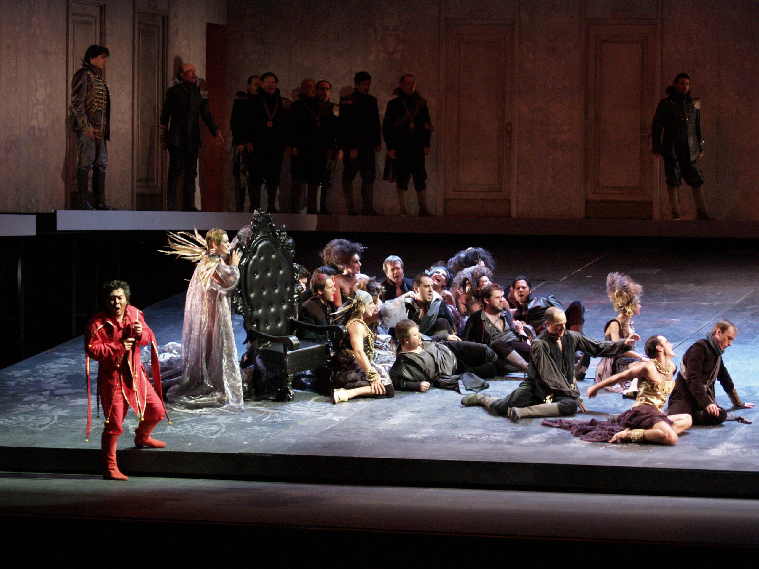 遊び人マントヴァ公爵に仕える道化師リゴレットは、公爵と廷臣たちが遊興を尽くす裏社会で媚びを売る生活。他ならぬ娘が公爵に弄ばれ、公爵への復讐を決意するものの、公爵を愛してしまった娘は殺し屋の前に身代わりとなって身を差し出す――。