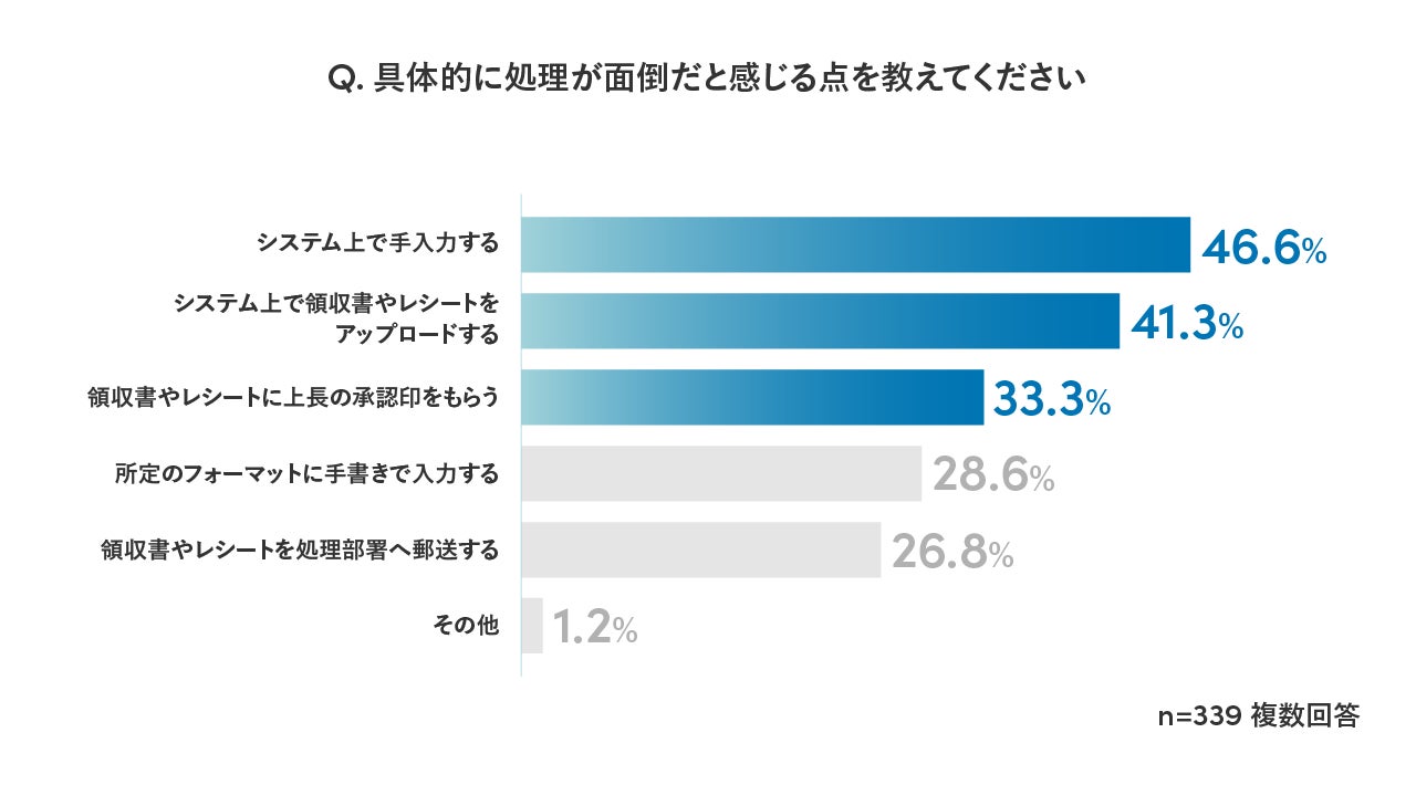 続けて、「精算処理が面倒」と回答した人に対し、具体的に面倒だと感じる処理を聞いたところ、「システム上で手入力する」(46.6%)が最も多く、次いで「システム上で領収書やレシートをアップロードする」(41.3%)、「領収書やレシートに上長の承認印をもらう」(33.3%)となりました。