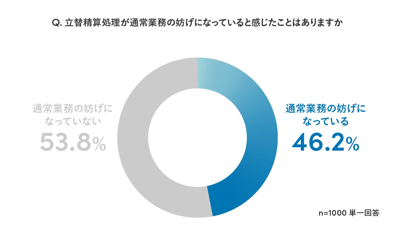 立替経費の精算業務が、通常業務の妨げになっているかを聞いたところ、46.2%が「通常業務の妨げになっている」と回答しました。