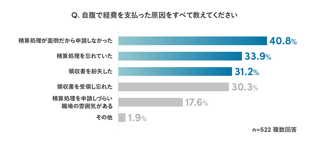 続けて、自腹を経験したことがある人を対象に、その理由を聞いたところ、最も多かったのは「精算処理が面倒だから申請しなかった」(40.8%)、次いで「精算処理を忘れていた」(33.9%)、「領収書を紛失した」(31.2%)となりました。