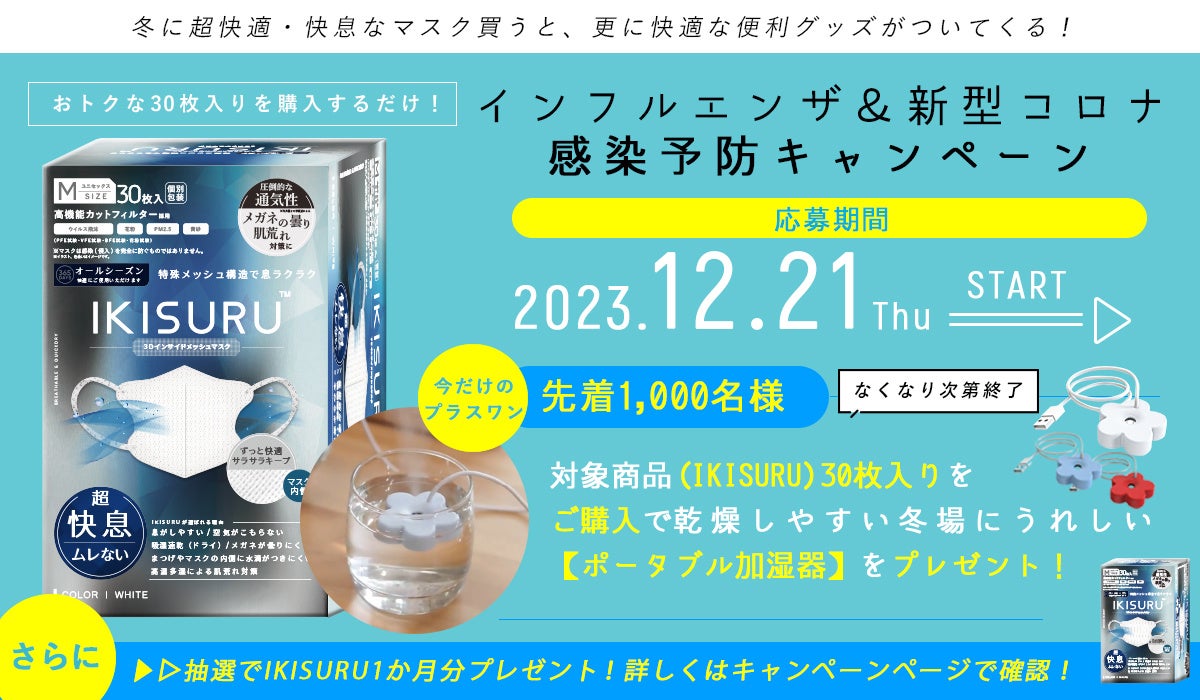 内側にメッシュ素材を使用した 通気性マスク「IKISURU」の30枚入りセットを購入した 先着1000名様にポータブル加湿器をプレゼントするキャンペーンを開催します。