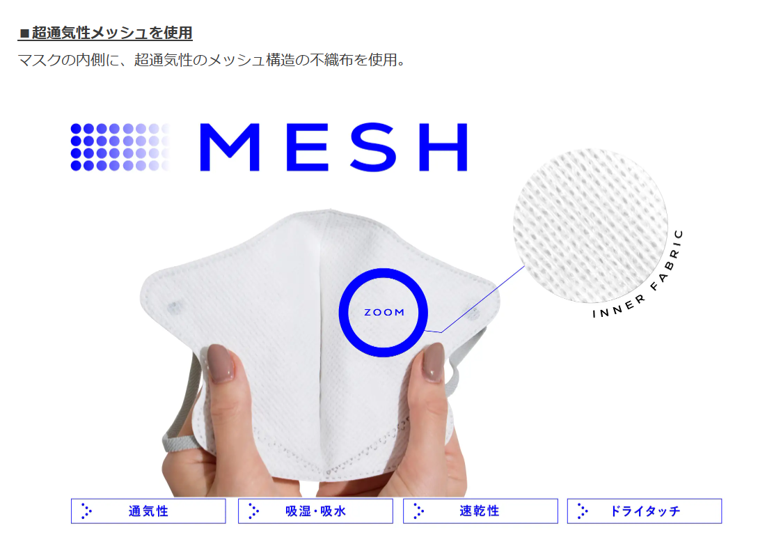 マスクの内側に、通気性のメッシュ構造の不織布を使用。