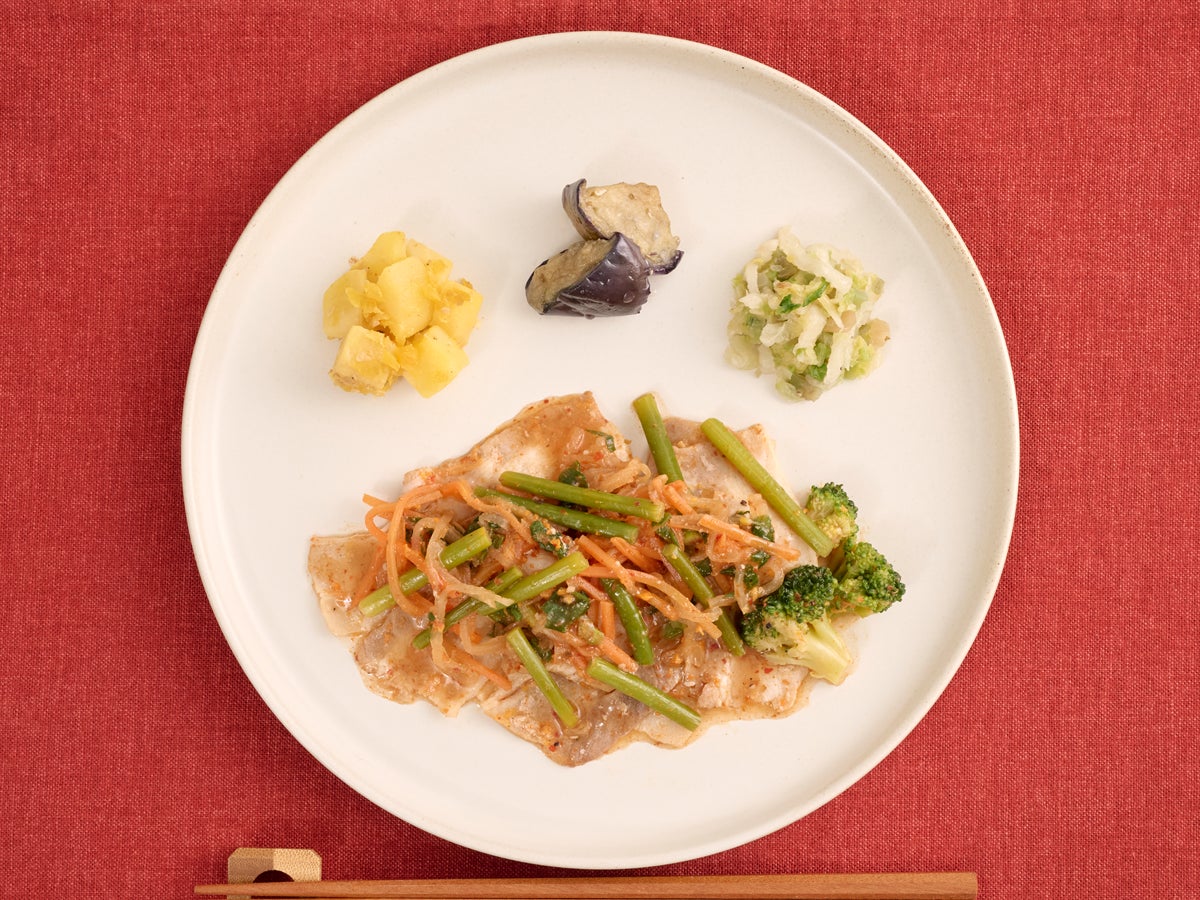 副菜は、ポリポリ食感が楽しいたくあん入り胡麻じゃが芋、やみつきになる茄子のにんにく塩、ほどよい塩加減がクセになる白菜ザーサイです。