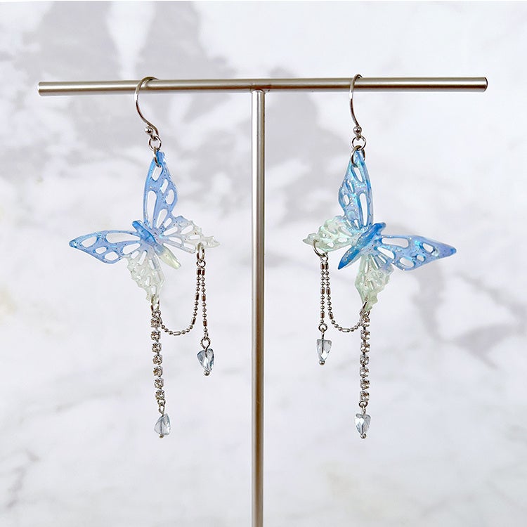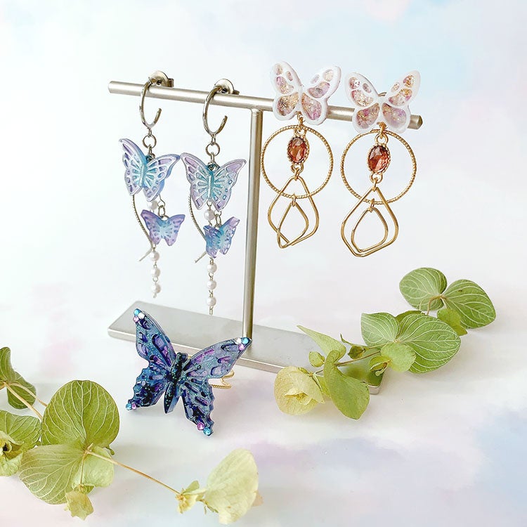 今回のバタフライ シリコンレジン型は7種類の蝶々が作れます。お好みの色のレジン液で、全体にワンカラー、ツートーンカラー、グラデーションカラーの他に、羽の部分を色別に分けてステンドグラスのような配色を施すことも出来るので、様々なカラーリングで素敵なバタフライアクセサリー作りをお楽しみいただけます。