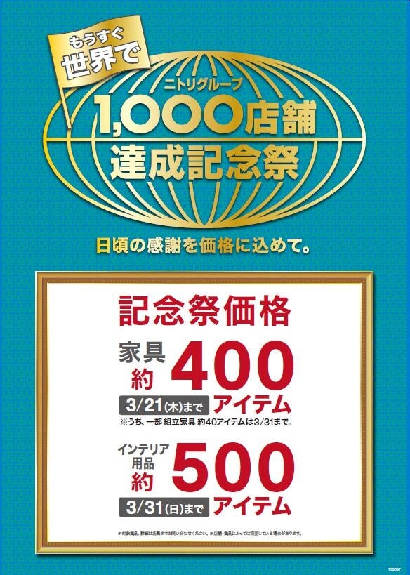 【ニトリHD】「もうすぐ世界で、グループ1,000店舗達成記念祭」を全世界で順次開催!日本国内は2月1日(木)からお得な記念祭価格スタート。