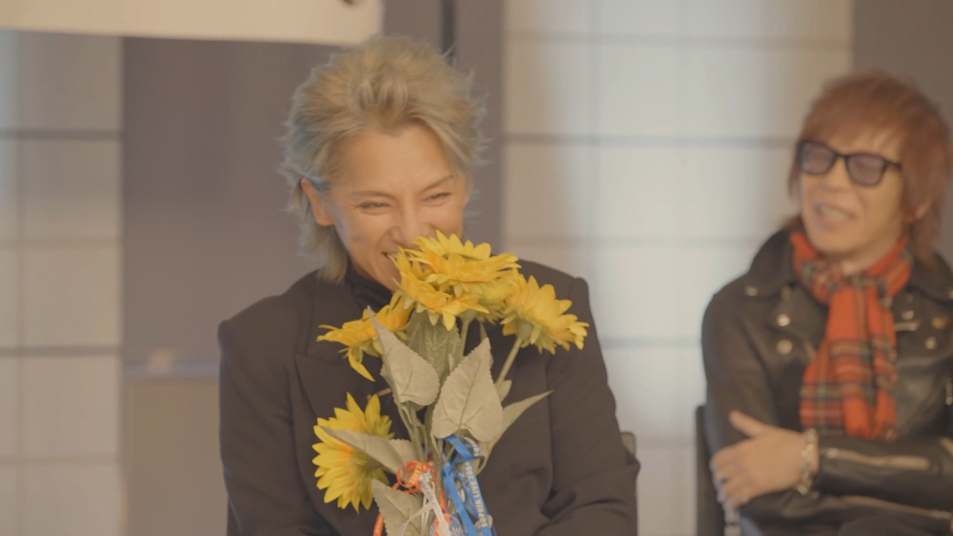「ライブにはどんな持ち物が必要でしょうか?」という質問をきっかけに、松岡がSIAM SHADEのメンバー4人へひまわりの造花をプレゼント。SOPHIAファンにはおなじみのアイテムを手に、「みんなでやろうよ」と掲げる栄喜。「ペンライトはOKですか?」とのコメントには、あこがれていたけれど実現する機会がなかったと悲しく返し、笑いを誘います。ひまわりを持つメンバーたちの姿には「似合う!」とのコメントも。