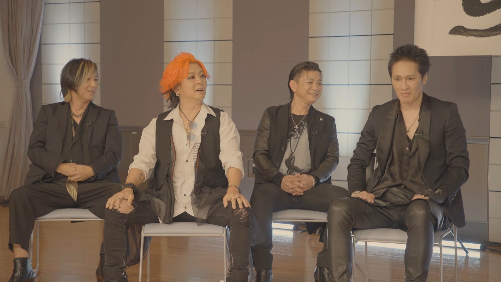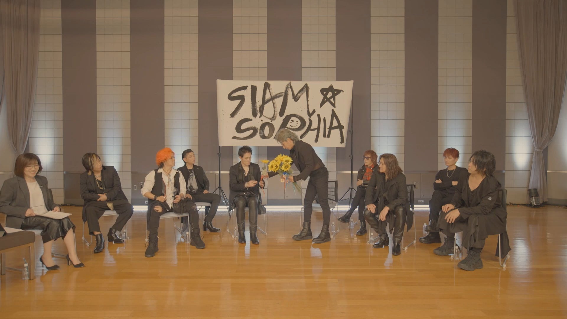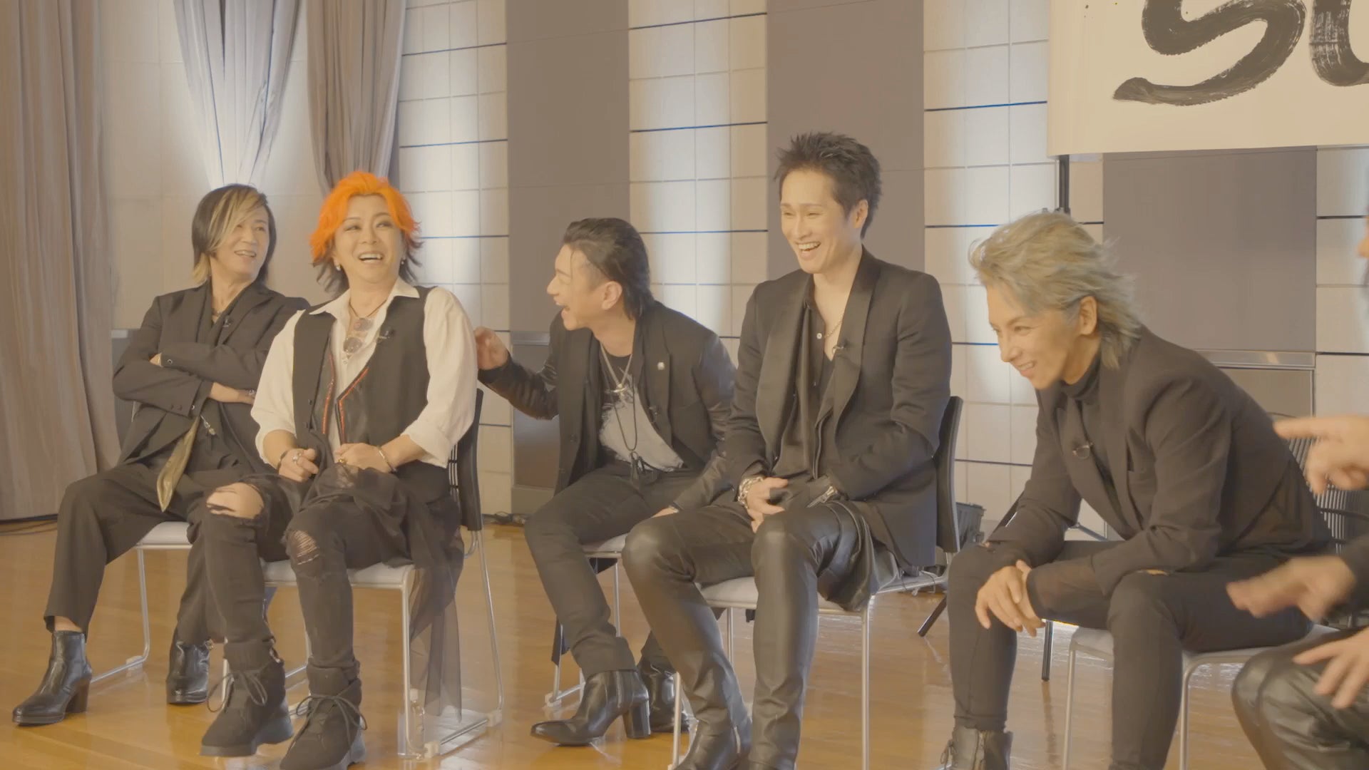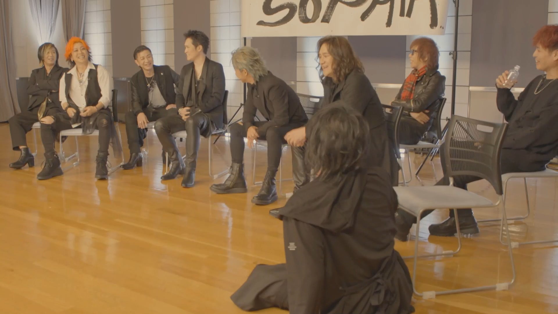 SOPHIAがSIAM SHADE4人のメンバーをあたたかく迎えるシーンからスタート。熱い抱擁や握手を交わしながら、「同窓会じゃん!」とお互いに声を掛け合います。笑顔あふれる和やかな空気のまま、9人集合の写真撮影へ。「ビジュアル系、カッコつけてください!」とSOPHIAのボーカル・松岡充が声をかけ、一気にクールな雰囲気に。