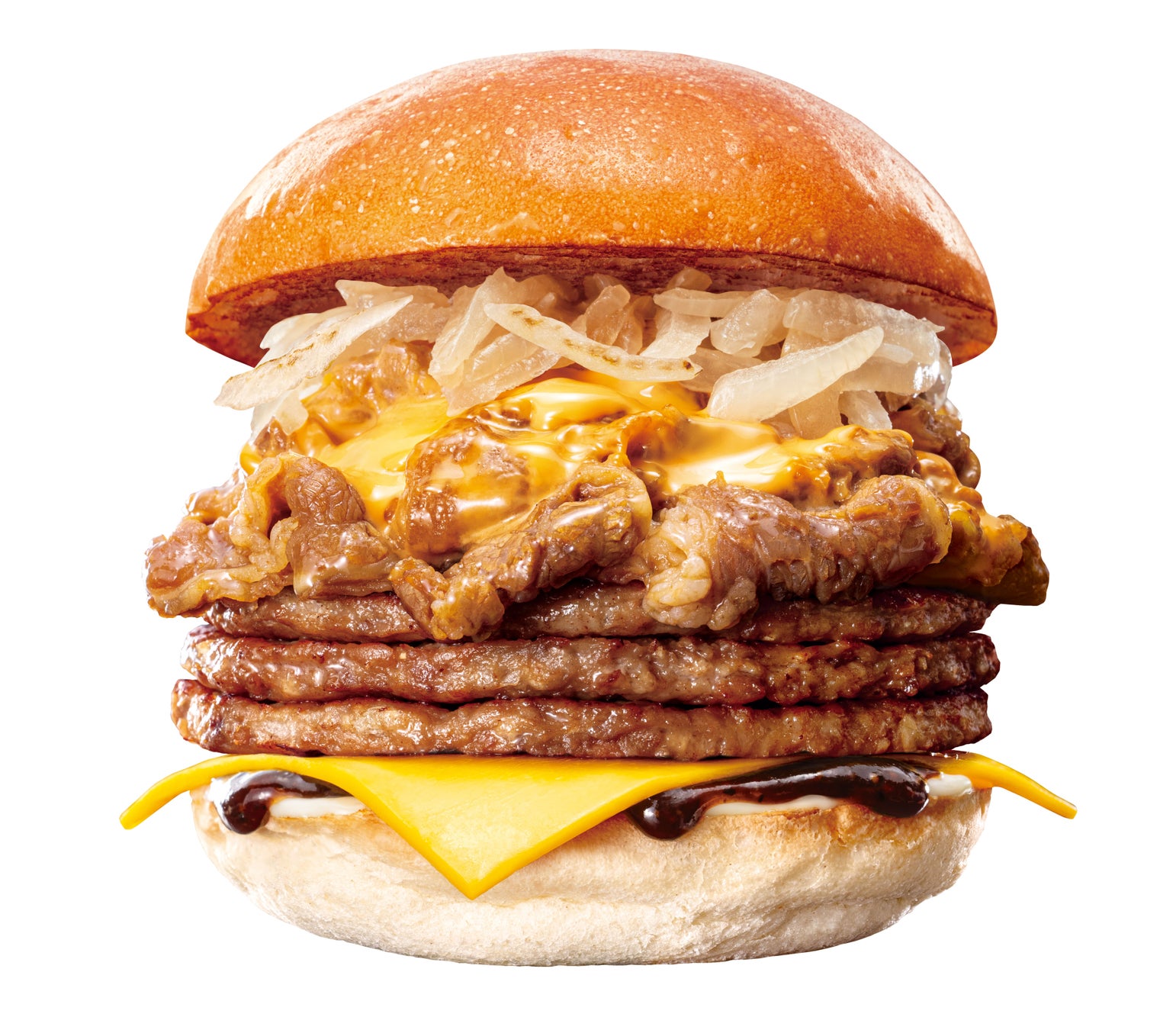 商品概要:「フィリーチーズステーキバーガー」の約2倍の量の牛カルビ肉を、3枚重ねたハンバーグパティや、とろ~り濃厚なレッドチェダーチーズソース、シャキシャキ食感のグリルドオニオン、スライスチーズ、オリジナルBBQソースなどとともにふんわりもっちり食感のバンズで挟んだ商品です。