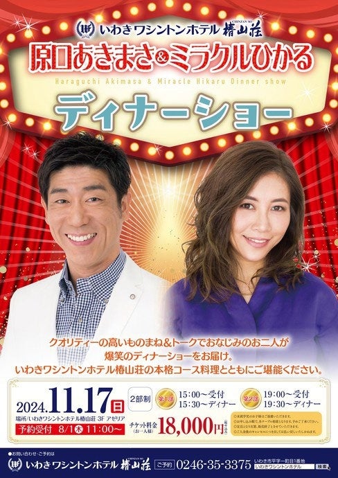 いわきワシントンホテル(所在地:福島県いわき市、総支配人:小林 隆太)は、2024年11月17日(日)に「原口あきまさ&ミラクルひかる ディナーショー」を開催いたします。本日8月1日(木)よりご予約受付けを開始いたします。