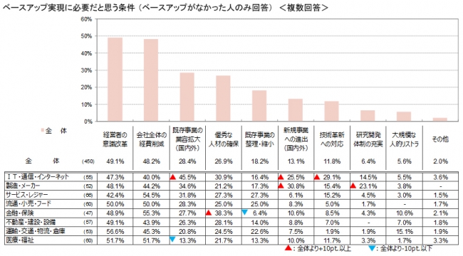 「ベアがなかった」と回答した人(64.6%)に、「ベアを実現するために必要だと思う条件」を聞いたところ、「経営者の意識改革」が49.1%と最も高く、「会社全体の経費削減」が48.2%と続いた。業種別では『IT・通信・インターネット』『製造・メーカー』は他業種に比べて「新規事業への進出(国内外)」「既存事業の業容拡大(国内外)」が高く、拡大方向への取り組みが必要と捉えている割合が他業種より高かった。
