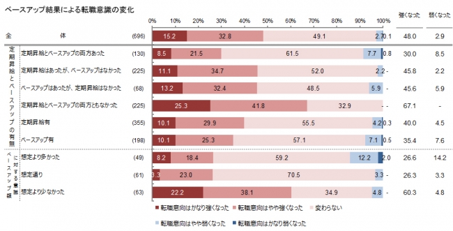 ▽ 定期昇給がない場合やベースアップ額が想定より少ない場合、転職意向が強まる傾向に