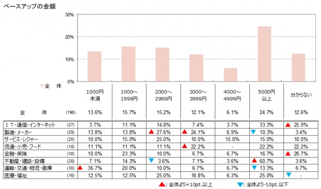 また、今回のベア金額を聞いたところ、「5,000円以上」が24.7%を占め、最も高かった。業界別では、『不動産・建設・設備』の6割以上が「5,000円以上」と回答し、景気の良さを感じさせる結果となった。
