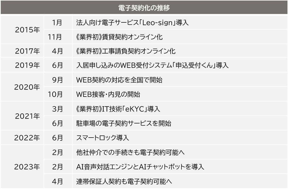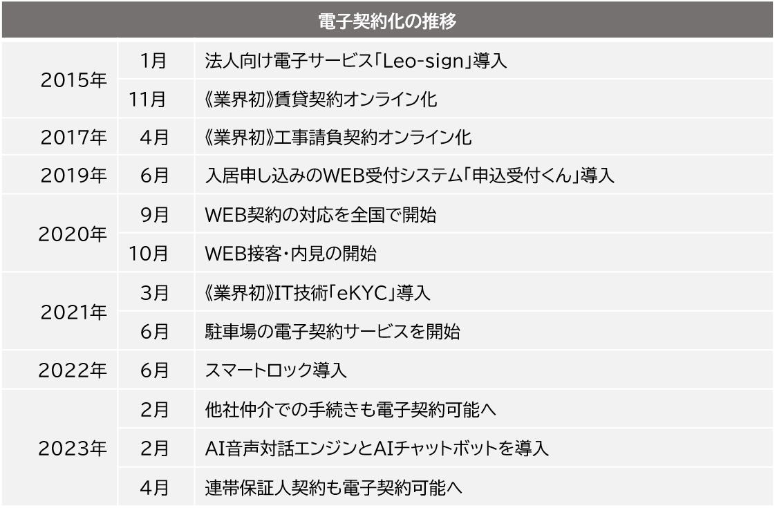 当社は、お客様の利便性向上のため、「WEB接客」や「WEB内見」を皮切りに、「スマートロック」や「Leo-sign」、個人向け電子契約サービスなど最新技術を導入してまいりました。さらに、AIによるチャットボットや音声対話エンジンも導入し、「不動産テック」を進めてきました。