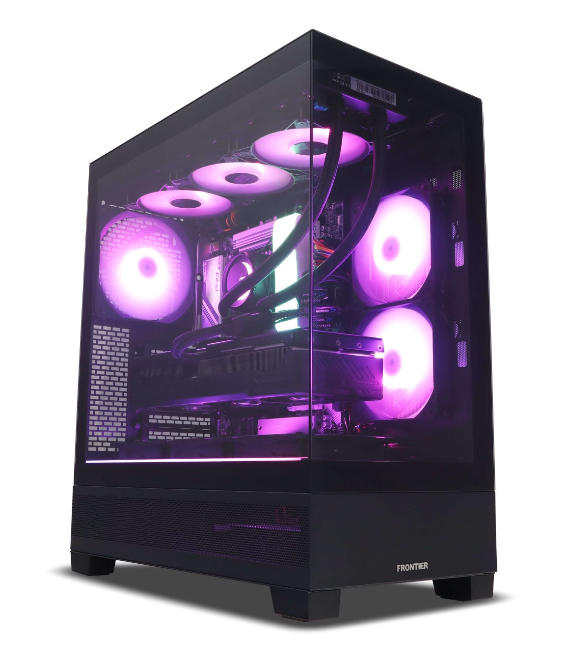 ◎GPLシリーズ: 前面左側の支柱がないピラーレスデザインのケースです。ライティングはすべてソフトウェアで制御可能で、6基の光るケースファンとケース側面のRGB-LEDラインがケースを美しく照らします。また、ケースカラーと同色の内部のパーツが、見た目の美しさを際立たせます。