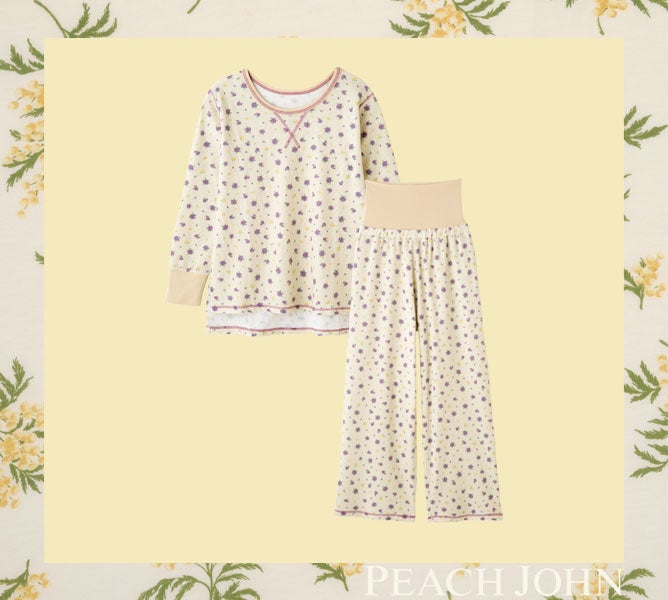 トップスはほどよい厚みがあり、肌側がパイル状のコットン混素材で、肌ざわりふんわり。ボトムは落ち感が良く、なめらかな肌ざわりのレーヨン混カットソー素材と上下異素材のコーディネートで、幅広く活用できます。春の気分も盛り上げる、ミモザ柄プリントは全2色展開。ミモザアイボリーのトップスはイエロー、ボトムはアイボリー地にイエローのミモザの花をちりばめた、品良く春らしいプリントです。ミモザネイビーのトップスはネイビー、ボトムは薄いブルーグレー地に、ミモザ・ラベンダー・かすみ草を合わせたブーケをプリントし、大人っぽい印象です。