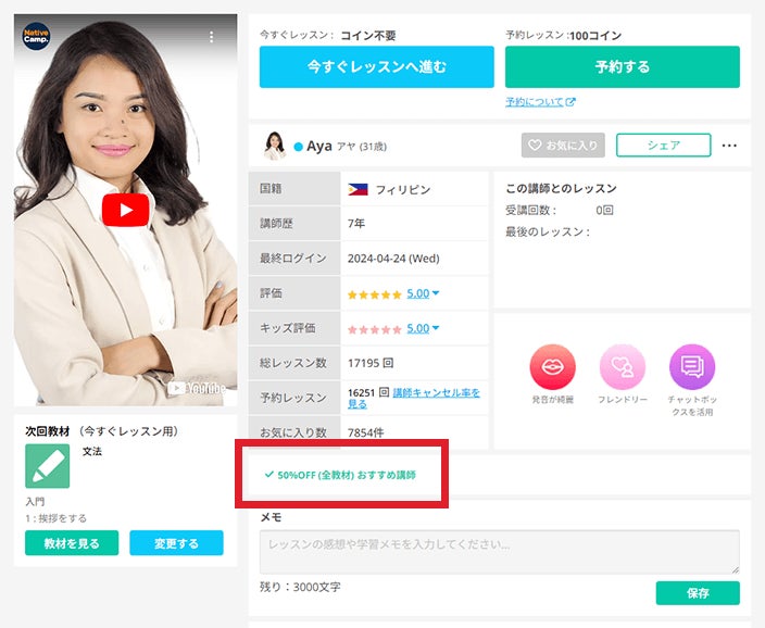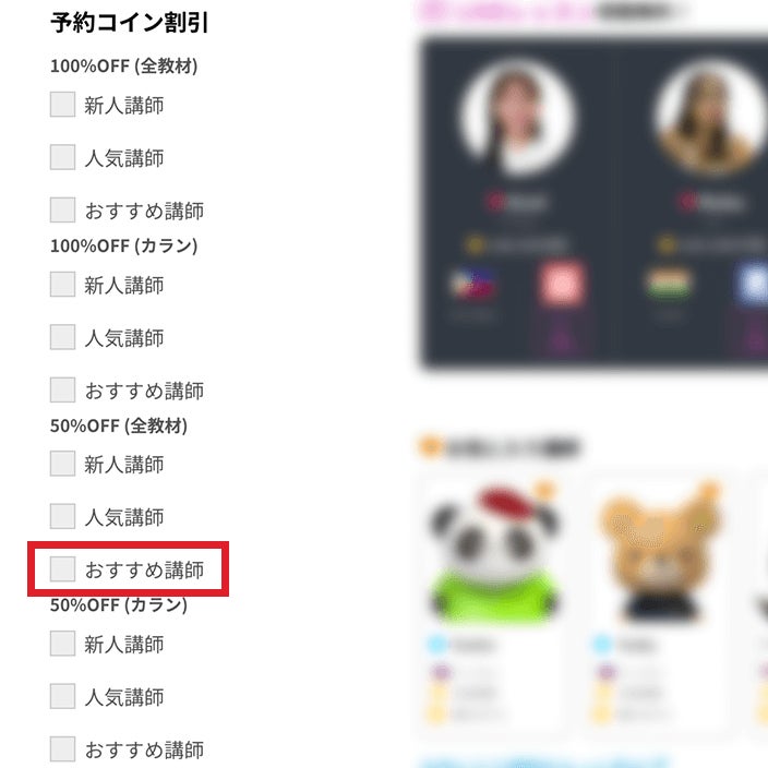 対象講師は、予約コイン割引の「50%OFF(全教材)おすすめ講師」で検索できます。