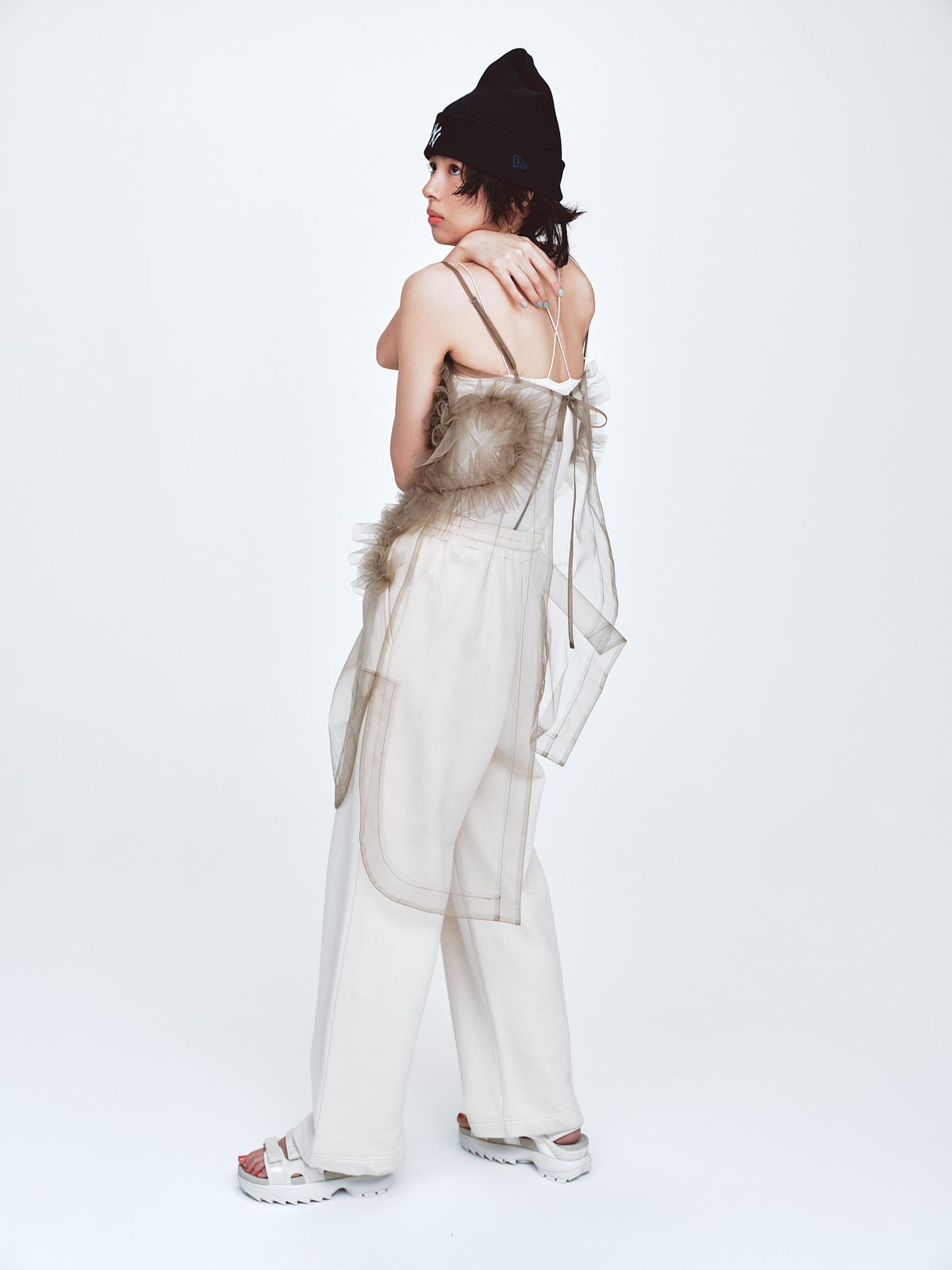 女性らしいエレガンスを表現する〈Chika Kisada〉からは、ハリのあるチュールを使った立体感のある『チュールワンピース』がラインナップ。スウェットパンツやニットキャップなど、意外な組み合わせで、チュールの透け感を際立たせたスタイリング。