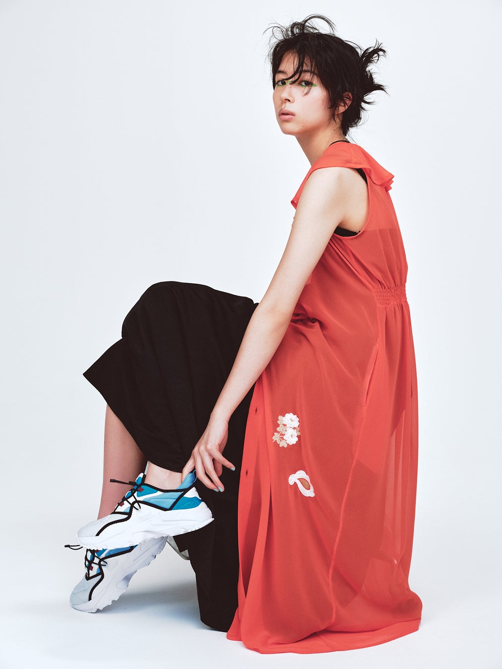 〈COMME des GARCONS(コムデギャルソン)〉のパタンナーを経てブランドを立ち上げた宮尾史郎が手掛けるファッションブランド〈MIYAO〉。ロマンティックなレースをふんだんに使った『シアーレースフリルワンピース』を着用し、繊細なギャザーや透け感を、あえて同系色のサロペットに重ねてカジュアルダウン。