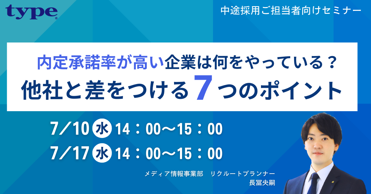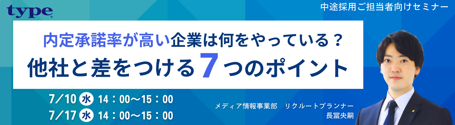 転職サイト「type」では、7/10(水)および7/17(水)の14時より「内定承諾率が高い企業は何をやっている?他社と差をつける7つのポイントを解説!」を開催いたします。