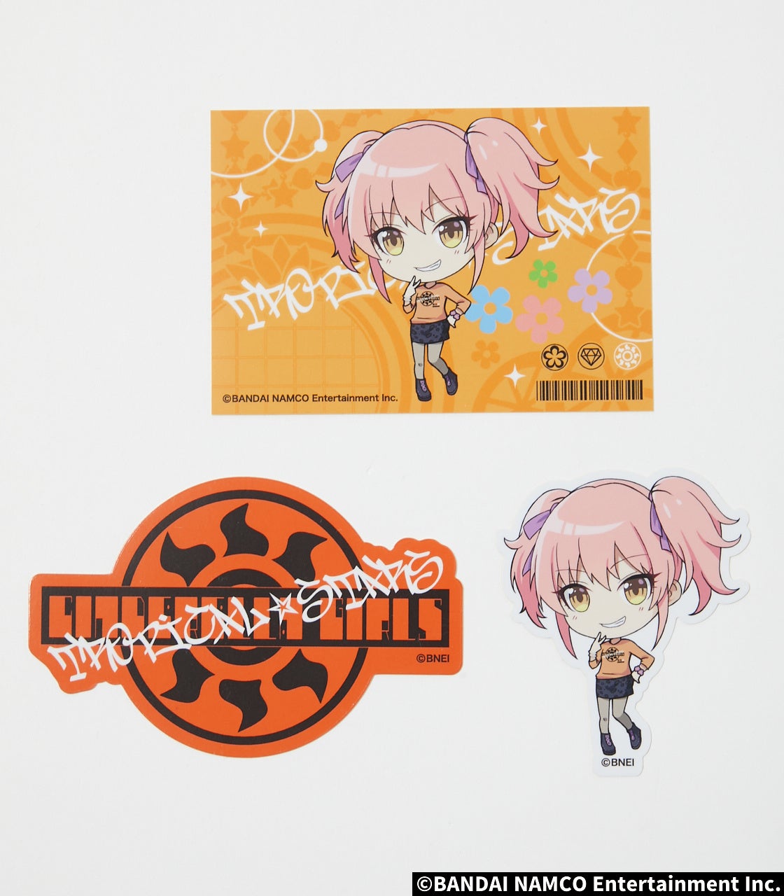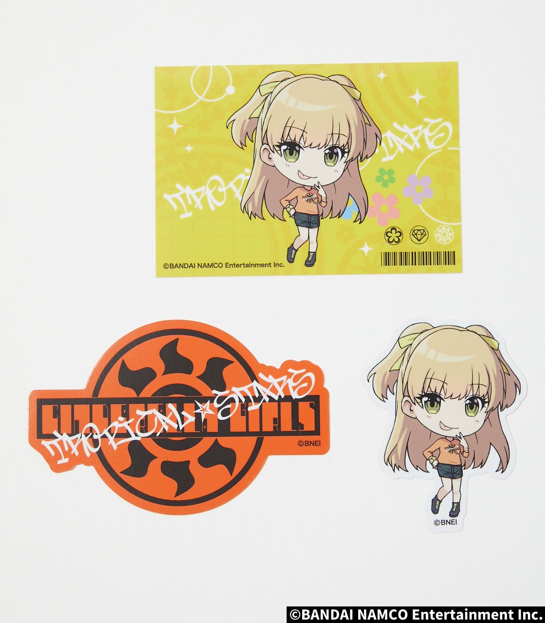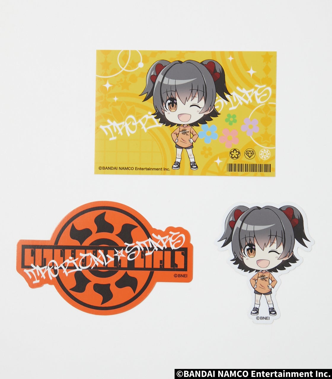 1枚で存在感のある背景付きのステッカー、アイドルがダイカットされたステッカー、ユニットロンTのデザインステッカーとお好きなデザインをご自由に貼って遊べるセット。