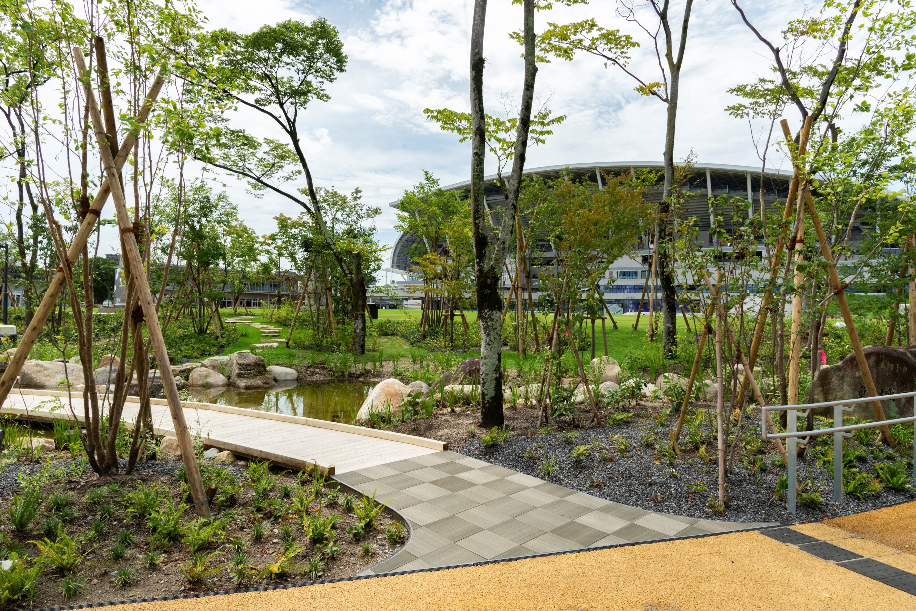 地球環境の未来に貢献できる「レビアペイブ」は、「ひろしまスタジアムパーク」の目指す”未来志向”に沿う商品として採用されました。ビオトープエリアの13.4㎡に施工され、これにより1,474kgのCO₂排出量削減に貢献します。