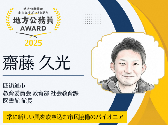 図書館という制度的・物理的枠組みを大胆に再編集し、市民の日常に溶け込む「居場所」へと変容させた実践力は圧巻。制度の設計者・変革者としての視座をもち、多様な担い手との関係性を育て続ける姿勢は、まさにこれからの公共をつくる公務員像です。