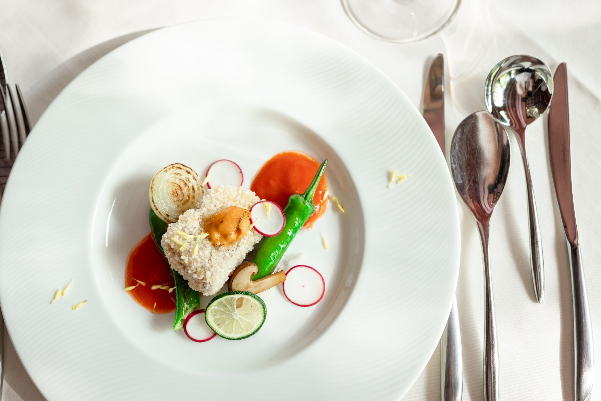 魚料理:白身魚のカダイフ巻き 夏野菜のタブ 柴漬けと梅のコンディマン