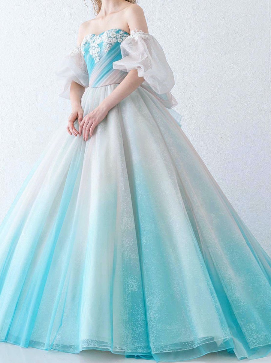 オリジナルのグラデーションプリントチュールをドレス全体に使用したボリュームライン。 デコルテが綺麗に見えるよう、ネックラインにビジューをレイアウトしています。 全体に使用したオーロラグリッターの輝きとバイカラーグラデーション のコントラストか美しい1着です。