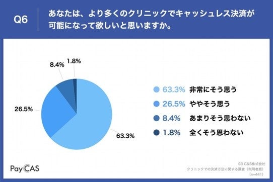 「Q6.あなたは、より多くのクリニックでキャッシュレス決済が可能になってほしいと思いますか。」(n=441)と質問したところ、「非常にそう思う」が63.3%、「ややそう思う」が26.5%という回答となりました。