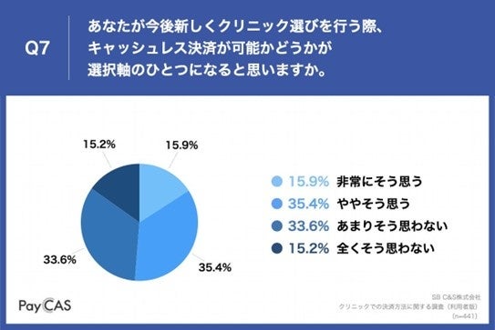 「Q7.あなたが今後新しくクリニック選びを行う際、キャッシュレス決済が可能かどうかが選択軸のひとつになると思いますか。」(n=441)と質問したところ、「非常にそう思う」が15.9%、「ややそう思う」が35.4%という回答となりました。