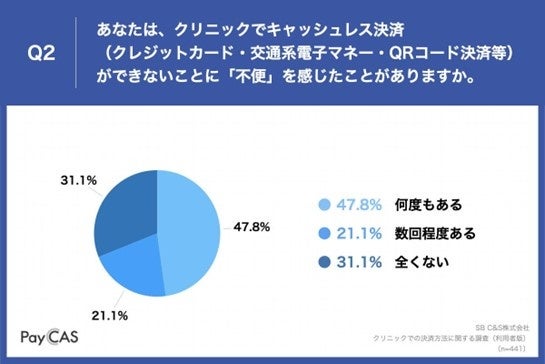 「Q2.あなたは、クリニックでキャッシュレス決済(クレジットカード・交通系電子マネー・QRコード決済等)ができないことに「不便」を感じたことがありますか。」(n=441)と質問したところ、「何度もある」が47.8%、「数回程度ある」が21.1%という回答となりました。