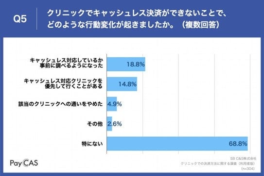 Q2で「何度もある」「数回程度ある」と回答した方に、「Q5.クリニックでキャッシュレス決済ができないことで、どのような行動変化が起きましたか。(複数回答)」(n=304)と質問したところ、「キャッシュレス対応しているか事前に調べるようになった」が18.8%、「キャッシュレス対応クリニックを優先して行くことがある」が14.8%という回答となりました。