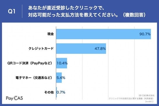 「Q1.あなたが直近受診したクリニックで、対応可能だった支払方法を教えてください。(複数回答)」(n=441)と質問したところ、「現金」が90.7%、「クレジットカード」が47.8%、「QRコード決済(PayPayなど)」が10.4%という回答となりました。