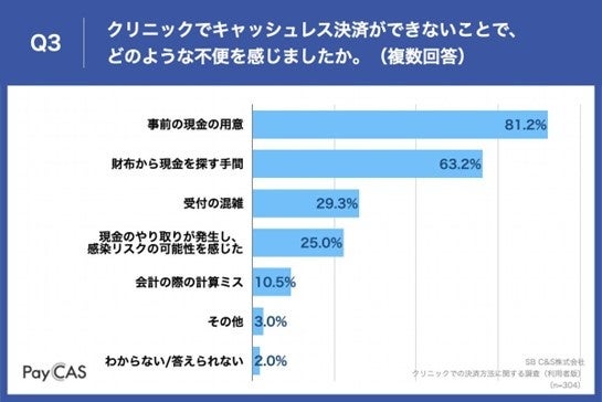 Q2で「何度もある」「数回程度ある」と回答した方に、「Q3.クリニックでキャッシュレス決済ができないことで、どのような不便を感じましたか。(複数回答)」(n=304)と質問したところ、「事前の現金の用意」が81.2%、「財布から現金を探す手間」が63.2%、「受付の混雑」が29.3%という回答となりました。