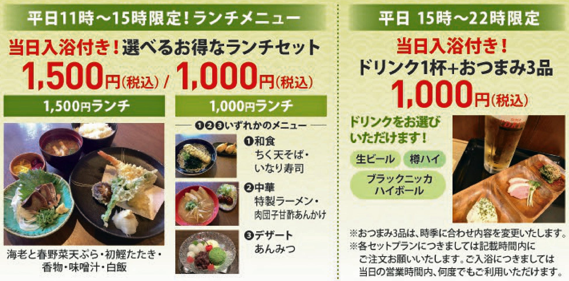 銀ゆばでは、お得に入浴できる食事プランをご提供!湯上がりに春のおすすめメニューでゆったりと、春の気分をお楽しみください。