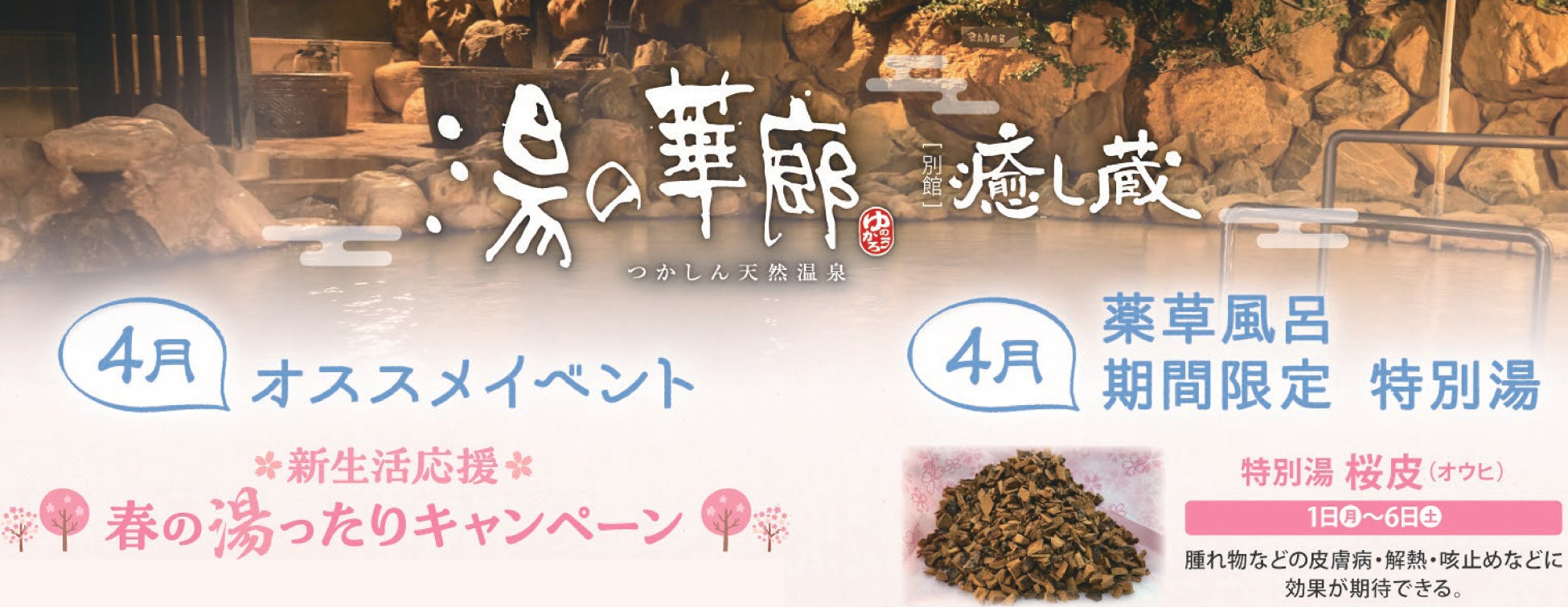 -春の特別湯は「薬湯 桜皮(オウヒ)風呂」、桜に包まれたつかしんへお越しください-