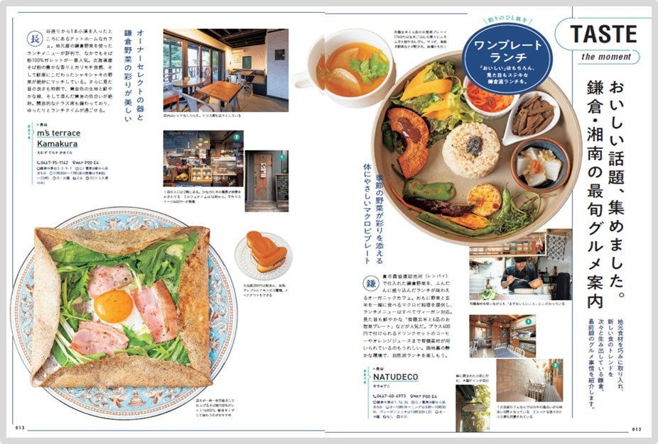 海街ならではの大パノラマのオーシャンビューが楽しめる絶景カフェをはじめ、鮮度抜群のしらすや彩り豊かな鎌倉野菜に出会える話題のレストラン、限定ランチ、隠れ家カフェなど “この一皿のために訪れたくなる” 名店を厳選しています。