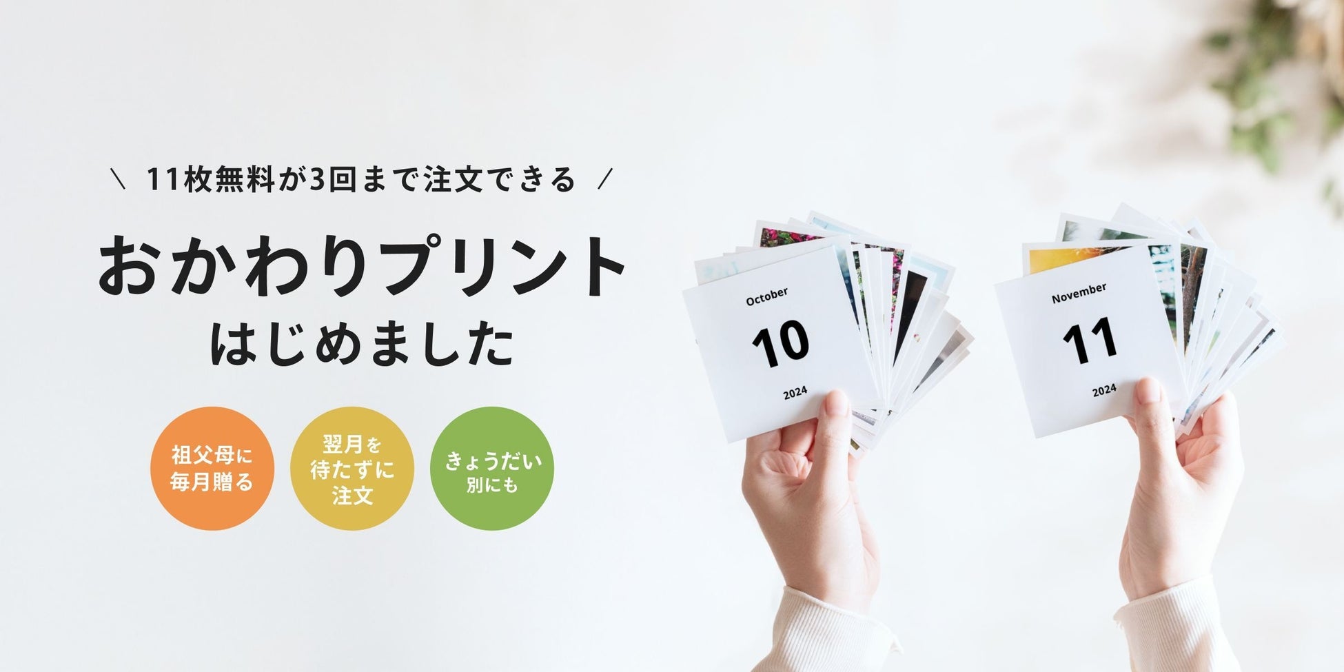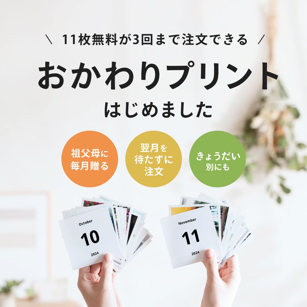 本日11月1日(金)より、毎月11枚無料の写真プリントを月3回まで送料のみで注文可能な「おかわりプリント」としてリニューアルを実施しました。これにより、祖父母へのプレゼントをはじめ、翌月まで待たずにこまめに注文できるほか、きょうだいごとのアルバム作成などにご利用いただけます。さらに、「みてね」で注文をまとめることで、複数サービス併用の手間を省き、写真の選び忘れや重複注文を防ぐことができます。